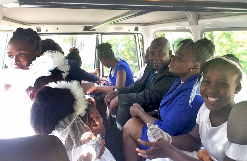 We would pull up at the designated bus stop and the whole crowd would try to pile right in! Once we even had to pull several boys out so the old people could get in. One group demanded that we take them somewhere else, but we had to get to the reception ourselves, so they had to give in!