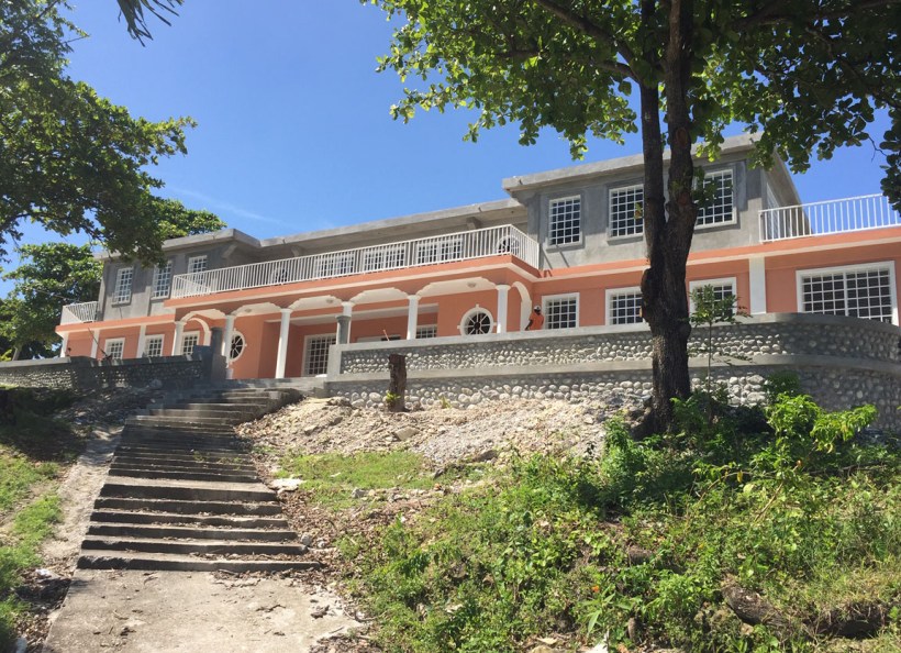 Rear of the building with view of the Guest House (far left on the next hill).